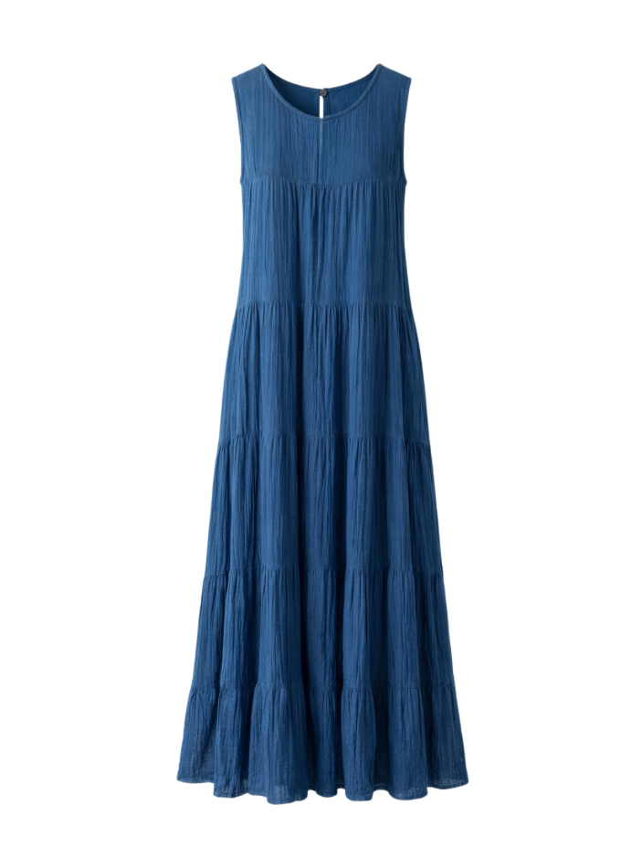 A softly flowing sleeveless dress in hand-dyed indigo cotton, designed for everyday calm and quiet beauty.